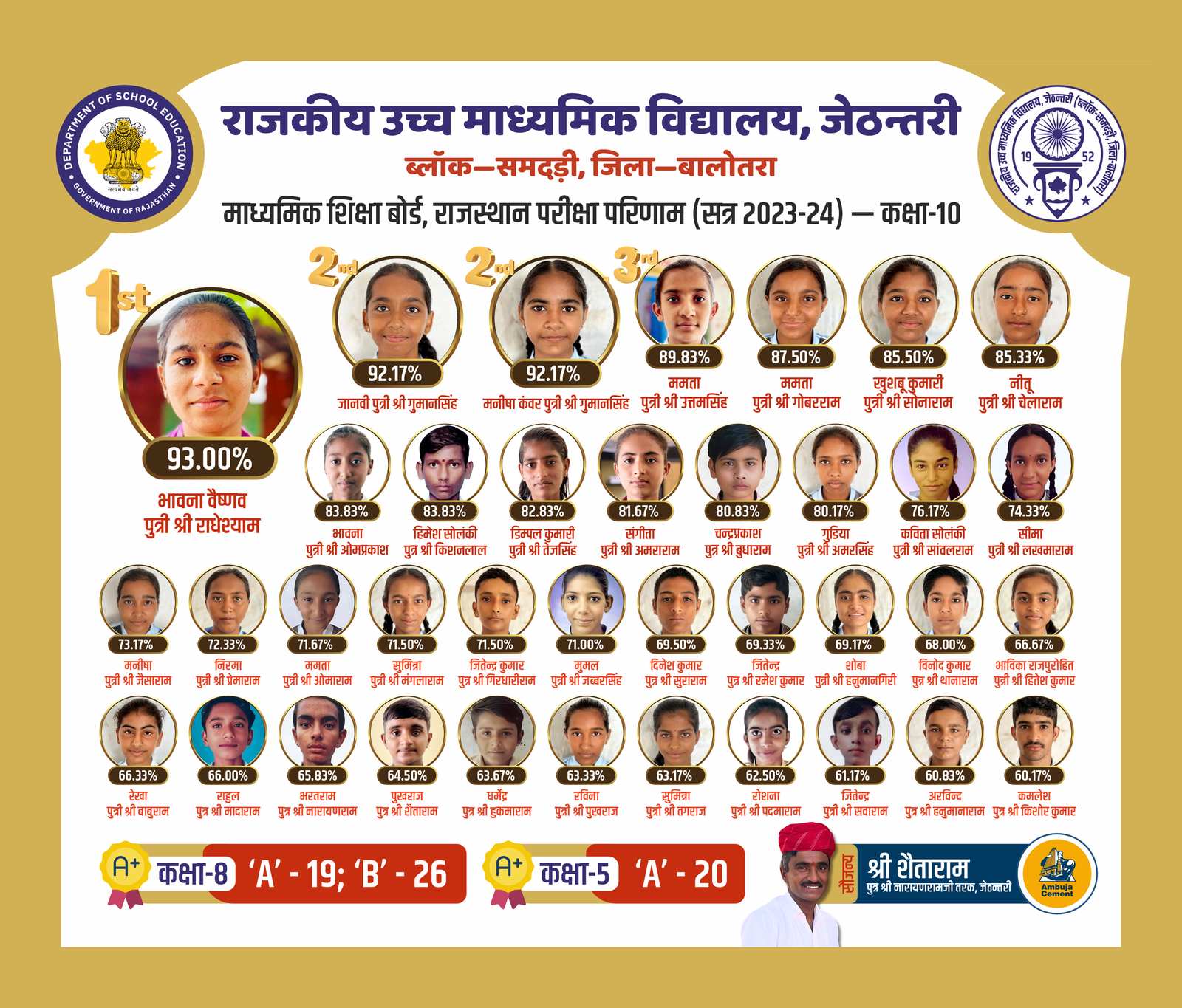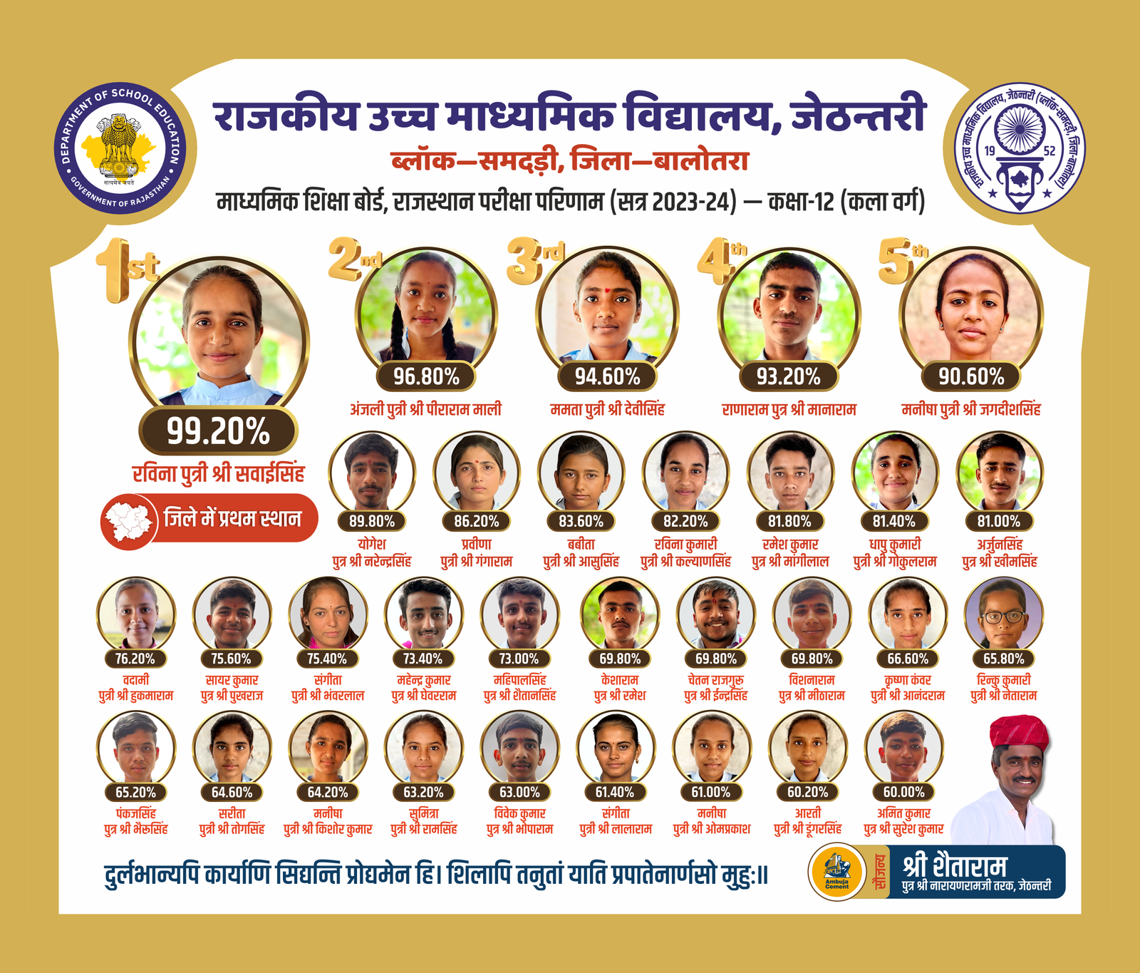 राजस्थान माध्यमिक शिक्षा बोर्ड, अजमेर द्वारा आयोजित सत्र 2023-24 के बोर्ड परीक्षा परिणामें में विद्यालय ने उत्कृष्ट प्रदर्शन किया है। यह परिणाम हमारे विद्यार्थियों की कड़ी मेहनत, शिक्षकों के अथक समर्पण और हमारे अभिभावकों के निरंतर सहयोग का प्रमाण है।