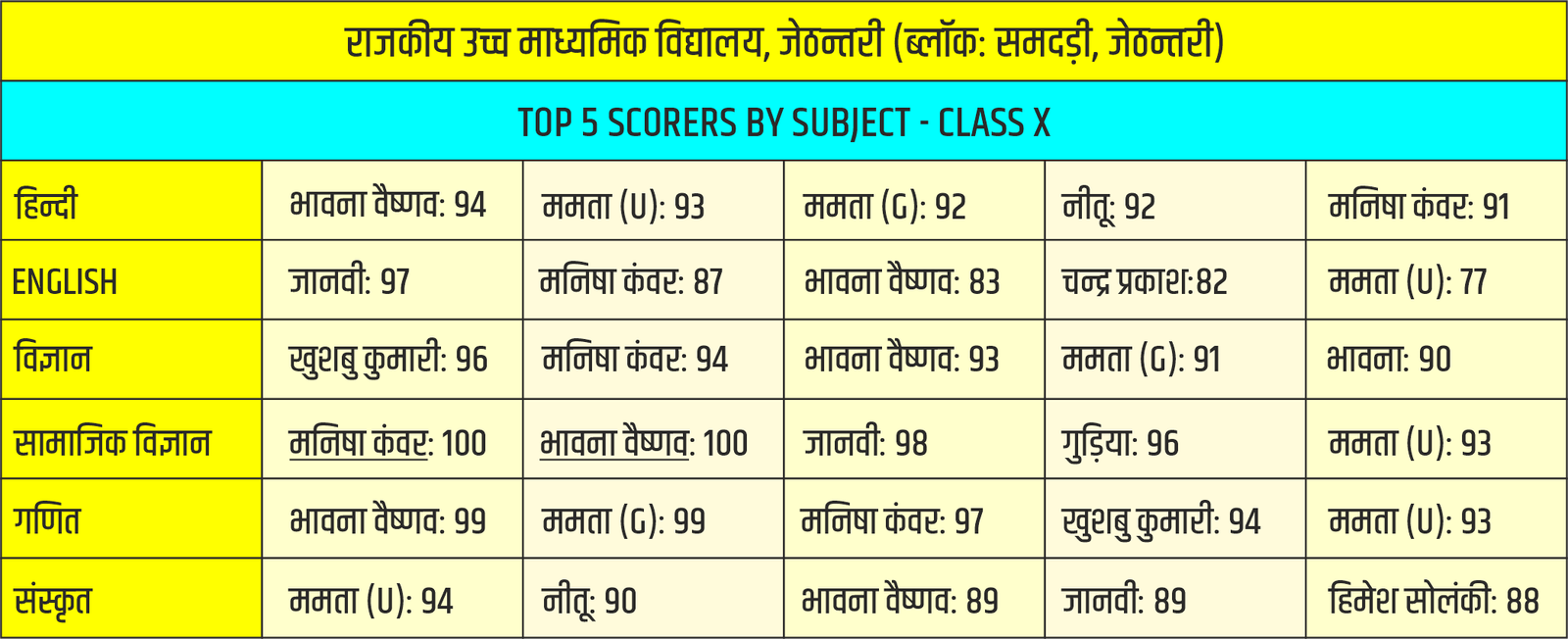 राजस्थान माध्यमिक शिक्षा बोर्ड, अजमेर द्वारा आयोजित सत्र 2023-24 के बोर्ड परीक्षा परिणामें में विद्यालय ने उत्कृष्ट प्रदर्शन किया है। यह परिणाम हमारे विद्यार्थियों की कड़ी मेहनत, शिक्षकों के अथक समर्पण और हमारे अभिभावकों के निरंतर सहयोग का प्रमाण है।